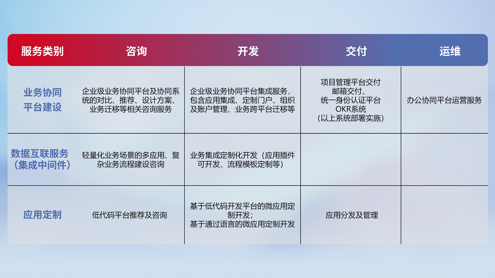 针对钉钉、、、企微、、IDaas等平台级产品提供产品的规划、、、、方案、、、交付、、定制化开发等服务,,,,实现如统一协同办公、、、智能客户服务、、混合会议管理、、智能数据查询、、、等业务场景,,实现数字化转型。。。。