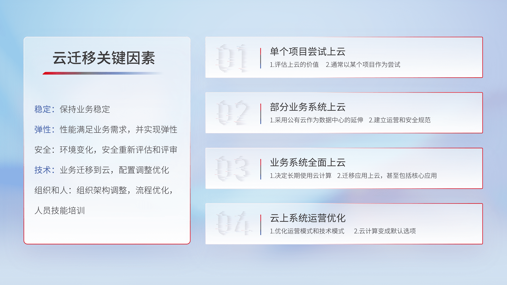 结合实际业务,,,,从规划设计、、、、云平台选型、、云原生改造、、、数据迁移、、集成交付,,,,迁移全过程为客户识别最佳上云路径,,,做好风险识别管理,,,设计网络架构、、身份权限、、安全审计合规、、操作审计、、、、日志审计、、、、监控告警策略、、、、多站点容灾设计等,,,,对云上基础设施进行整体规划,,,,提升IT治理水平,,,,以满足弹性、、、高可用、、、高性能的需求。。