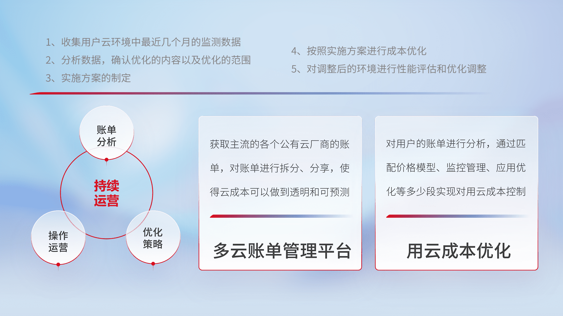 通过多云纳管,,,,以统一的资源数据模型把客户的云资源进行抽象和封装,,,进而实现对多云资源的统一操作,,,,保障云资源管理的可靠性、、稳定性与可用性。。量身定制化运维内容,,,,配置、、、、开发运维、、补丁管理、、、、备份、、、、监控、、、认证和访问管理、、、审计和日常巡检等,,保障在用云过程中的可靠度,,,稳定度以及高可用率。。。。
